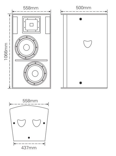 F215由兩個15"紙錐低音單元與一個51mm聚酯膜釹磁壓縮單元組成,低音單元音圈為75mm,鋁盆架。可用於大型擴聲係統中作延時補聲隻用。提供9個M10吊掛點,用於固定安裝中吊掛和調節角度。箱體由18mm的中纖板構成,箱體表麵為耐磨的黑色點紋防水油漆。後接線板兩個並聯的SPEAKON 4芯插座方便連接 ,黑色外覆透聲穿孔鐵網保護羞羞视频黄色單元。