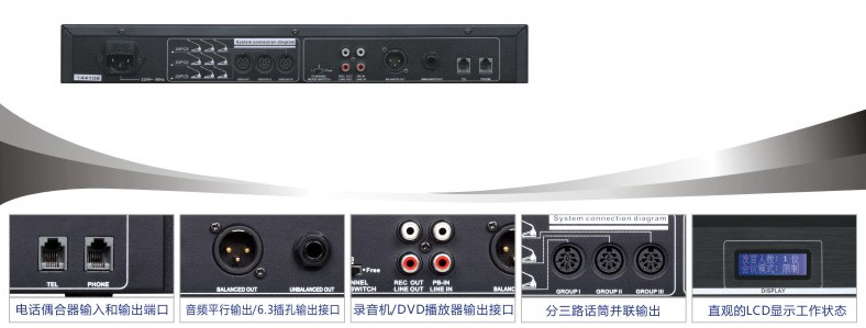 音量輸出調節器。內置電話偶合器輸入和輸出端口,可用來召開遠程電話會議,根據通信原理把電話通信的雙向話音信號分成輸入、輸出,
